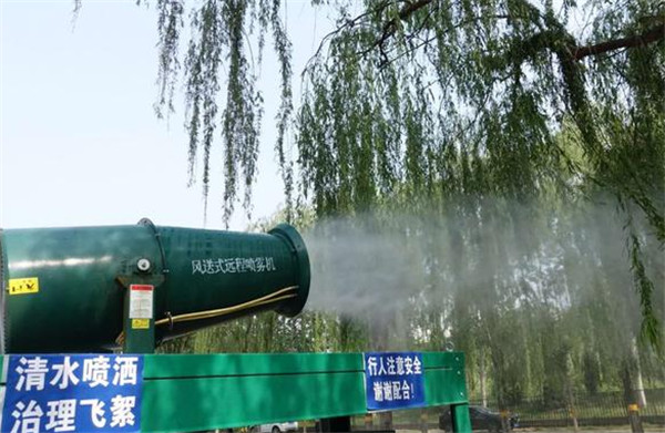 炮遠距離噴霧這種方式減少飛絮,做到“應濕盡濕、應掃盡掃”。