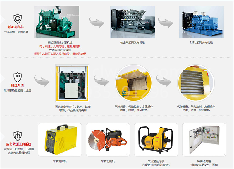 力最高可達1500-3000立方每小時,提供的電源可達100-200千瓦,根據用戶的需要配備一些搶險工具,在救災