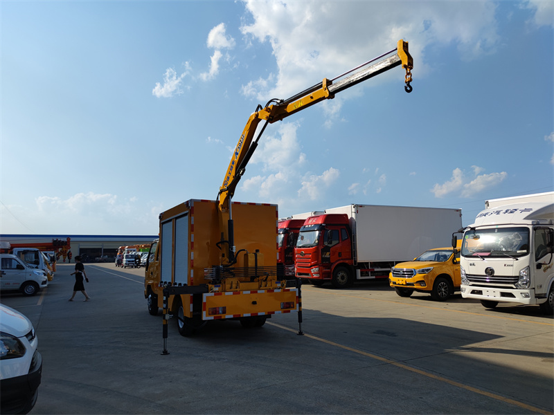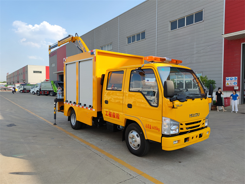 上裝配置:廂體采用專用鋼板,矩形鋼管焊接成型,內(nèi)外封板,地板為花紋板,內(nèi)飾鋪小花紋鋁板,廂體兩側(cè)配鋁合金卷簾門(帶鑰匙鎖)。廂體內(nèi)LED,DC12V照明燈,,接地鋼釬及接地線,車載2KG滅火器及固定支架,長排警燈,專用裝置為30KW柴油發(fā)電機(jī)組壹臺,便攜式電焊機(jī)壹臺,500立方每小時大流量排水泵一臺。尾部裝二噸徐工折臂吊機(jī),吊機(jī)型號為SQZ32,吊機(jī)最大起重質(zhì)量為2000kg,工作高度7.5米,工作半徑5米。