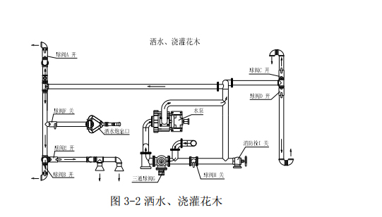 3)應(yīng)急消防 在應(yīng)急消防時(shí),其操作程序是:調(diào)節(jié)三通球閥 G 到如圖位置(注意:三通球閥凹坑所 對(duì)方向關(guān)閉),關(guān)閉不銹鋼球閥 ABCDE 和鋁合金球閥 H,打開消防栓 I 和不銹鋼 球閥 F,踏下離合,打開取力器開關(guān),慢慢松開離合(千萬不可過快,否則將會(huì)損壞取力 器或變速箱),使水泵開始工作,即可通過灑水炮和消防栓出口應(yīng)急消防,停止工作后開 關(guān)回位。 工作水路示意:水經(jīng)過水罐出口、三通球閥 G、過濾網(wǎng)、泵、消防栓和灑水炮。(其中 A BCDEH 關(guān)閉)。 圖 3-3 應(yīng)急消防