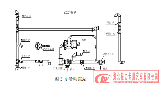 4)活動(dòng)泵站 做活動(dòng)泵站時(shí),其操作程序是:在三通球閥 G 處接一膠管,調(diào)節(jié)三通球閥 G 到如圖位 置(注意:三通球閥凹坑所對(duì)方向關(guān)閉),關(guān)閉不銹鋼球閥 ABCDEF 和鋁合金球閥 H,打開消防栓 I,接出口管。踏下離合,打開取力器開關(guān),慢慢松開離合(千萬不可過快, 否則將會(huì)損壞取力器或變速箱),使水泵開始工作,即可實(shí)現(xiàn)活動(dòng)泵站的功能,停止工作后開 關(guān)回位。 工作水路示意:水經(jīng)過三通球閥 G、過濾網(wǎng)、泵、消防栓 I。(其中 ABCDEF H 關(guān)閉)。