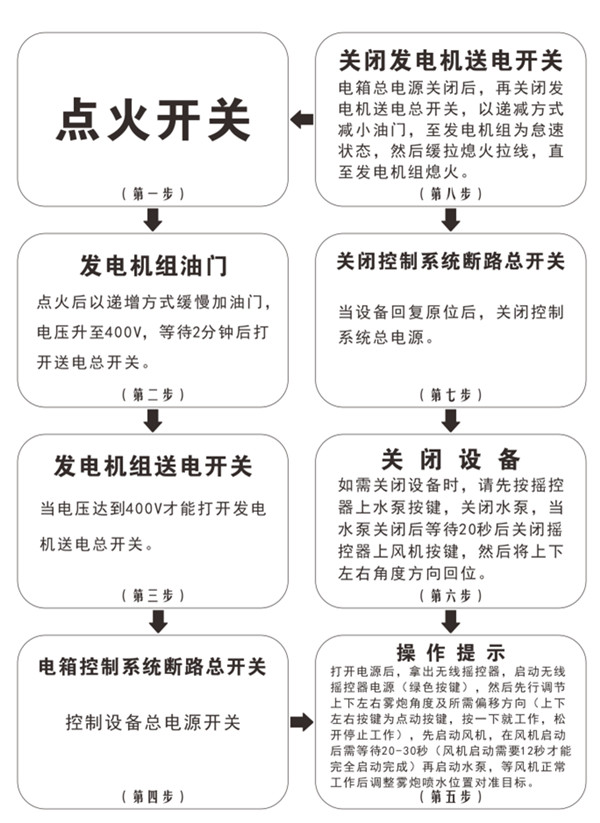 打開電控箱門,打開電控斷電總開關,(無線搖控情況下)拿出搖控器,啟動搖控器電源(綠色開關),然后先行調節上下左右霧炮角度及所需偏移方向(上下左右按鍵為點動按鍵,按一下就工作,松開停止工作),在啟動風機,在風機啟動后需要等待20-30秒(風機啟動需要12秒才能完全啟動完成),在啟動水泵,等風機正常工作后調整霧炮噴水位置對準目標。
